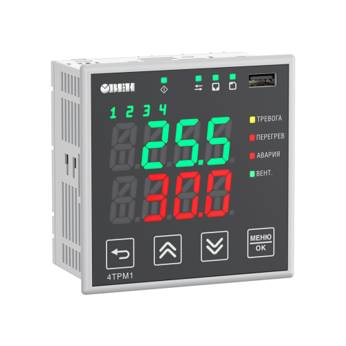 4ТРМ1-ТР оснащен трехцветной индикацией: зеленой, желтой и красной. В зависимости от измеренной температуры индикаторы автоматически изменяют цвет, сигнализируя о приближении к пороговым значениям или превышении допустимого температурного диапазона.